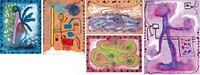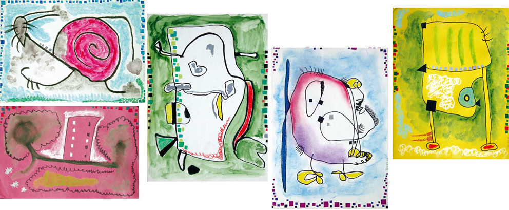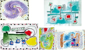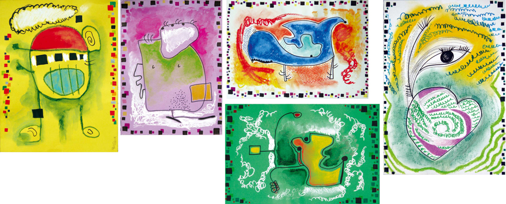 Dibuixos sobre cartolina en tècnica mixta (rotulador, ceres, ceres aquarel·lables, pastel)