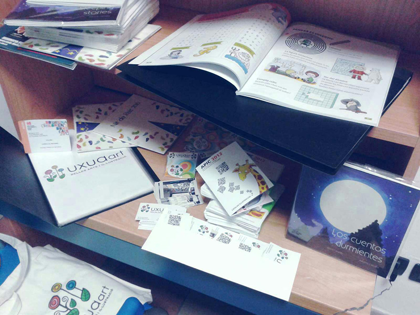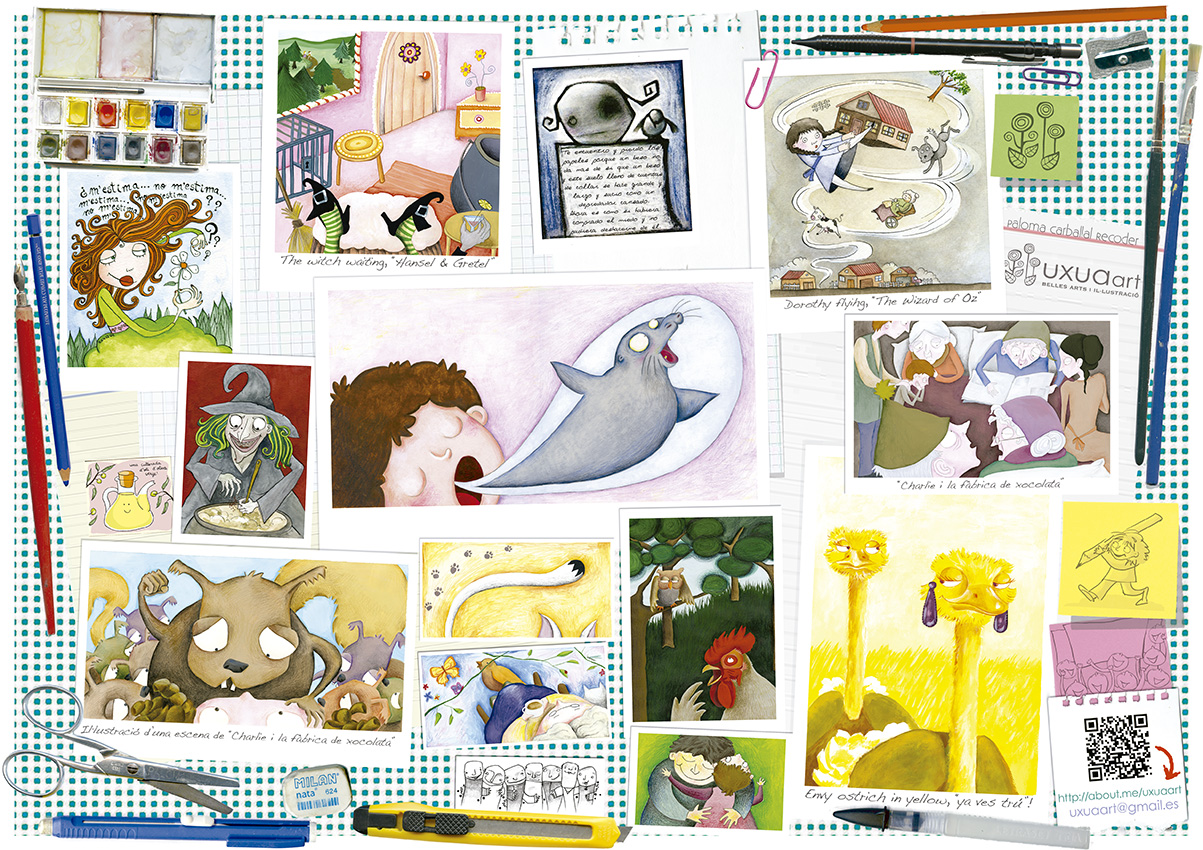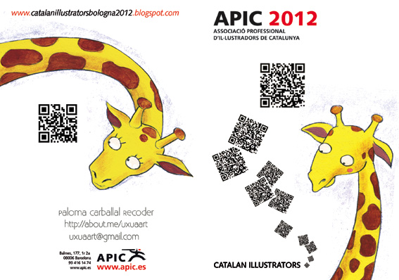 Díptic tamany A5 on hi vaig col·locar diferents exemples del meu treball, per a entregar-ho i repartir-ho com a una petita mostra al diferents estands de la Fira del Llibre infantil de Bolònia