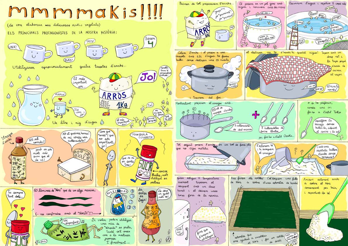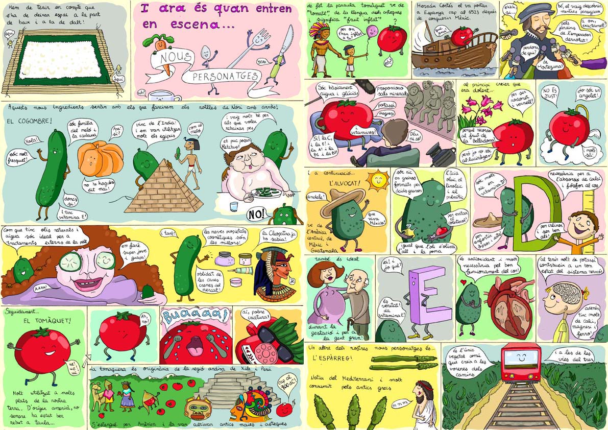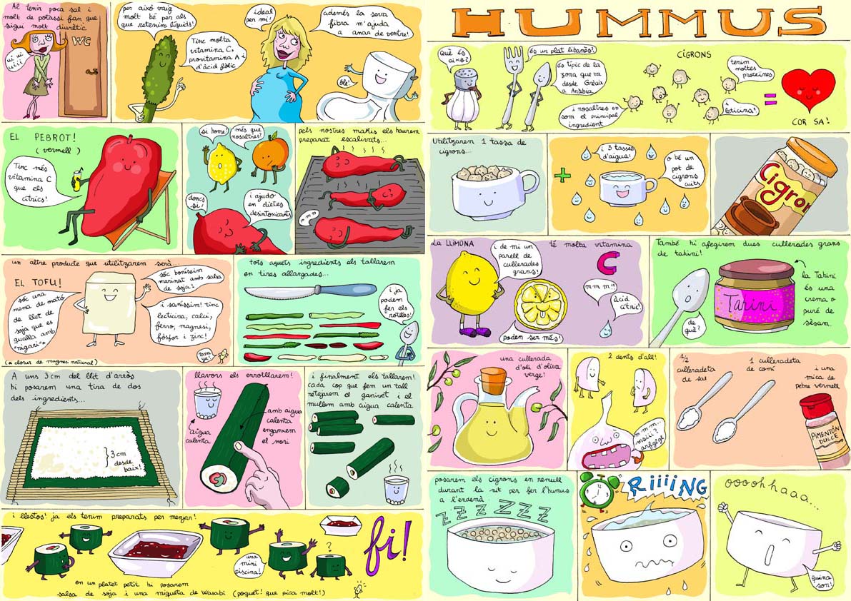 Còmic realitzat amb rotulador i tècnica digital que descriu diferents receptes vegetarianes que van ser publicades a l’exemplar gratuït de la revista “Animalis” d’Anima Naturalis